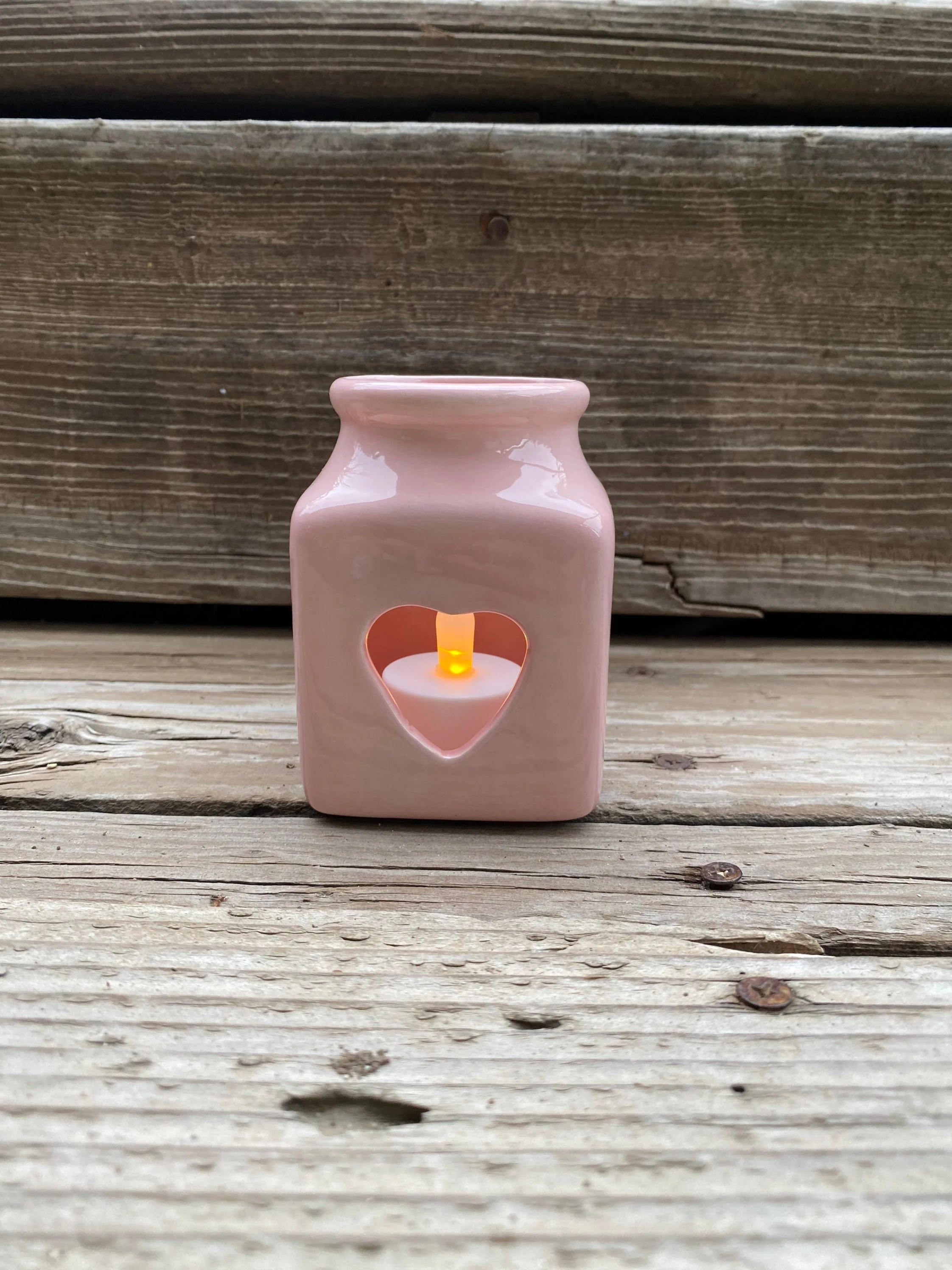 These sweet heart candle votives are a great addition to any Valentine or Galentine party! The piece is 3.75” and 2.5” wide. A battery operated light or small tea light may be used to light the holder.